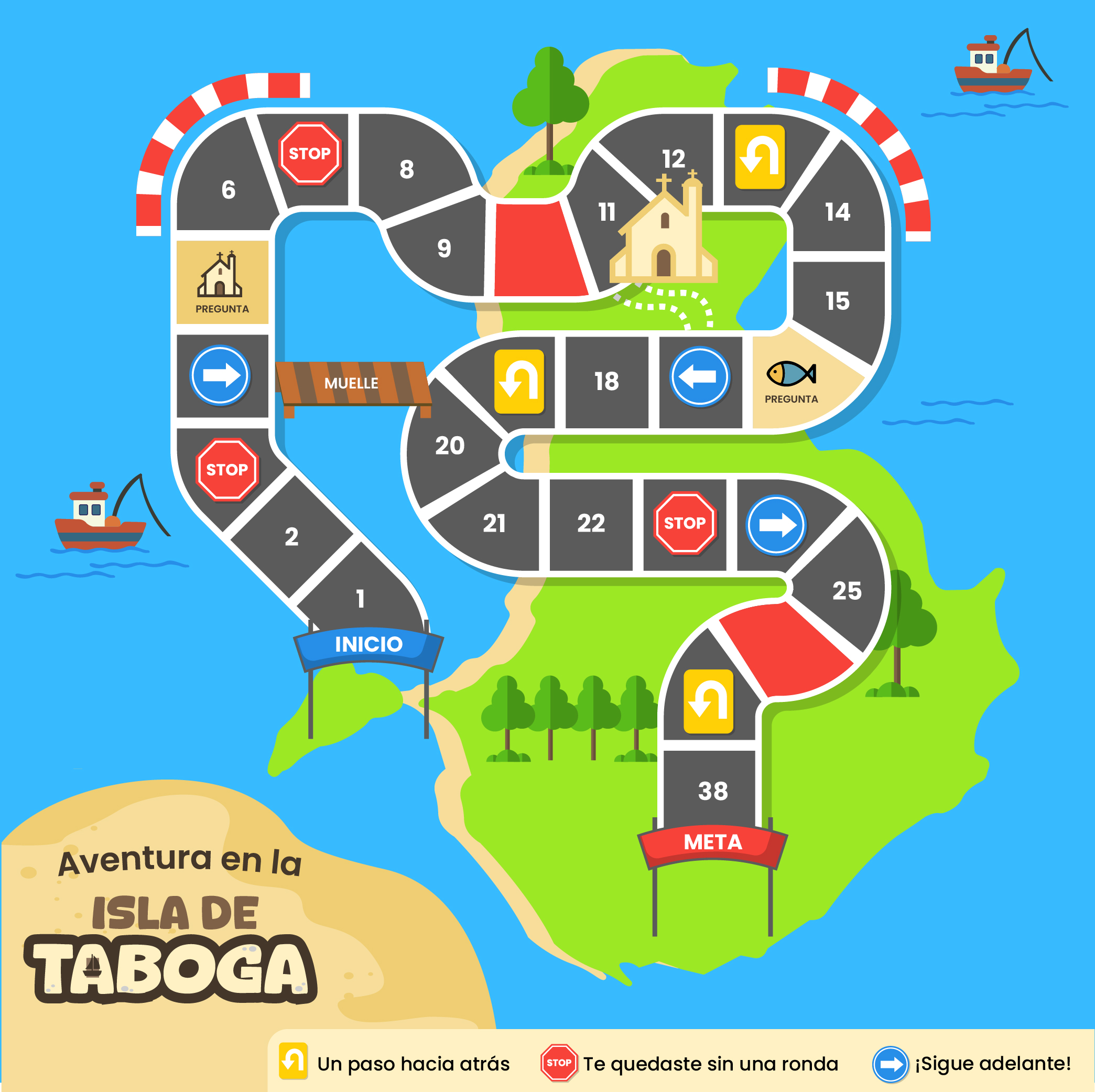 ¡Bienvenidos a la Aventura en la Isla de Taboga! Este juego de mesa te invita a descubrir la magia de Taboga mientras exploras su historia, su cultura y su biodiversidad… ¡todo a través de la emoción de los dados y las tarjetas sorpresa! El tablero tiene la forma de la isla vista desde arriba e incluye símbolos que te harán sentir allí mismo: barcos pesqueros, palmeras, el muelle icónico y más.